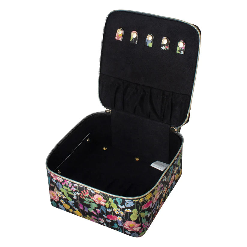 Introducing the patented-designed Large Jewellery Cube in Liberty Fairytale Forest, the perfect storage solution for your precious accessories. With double gold zips that open up to reveal 5 necklace clasps, three accordion-style internal zip pockets, a ring holder, an earring holder and an additional elasticated pocket on the base of the cube, this is the ultimate jewellery or sewing notions organiser.